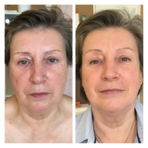 Bio Faszial Straffung von müden und hängenden Augenlidern, abgesunkenen Brauen + Strukturverbesserung und Gewebefestigung der Wangen und im Kinn-Hals-Übergang